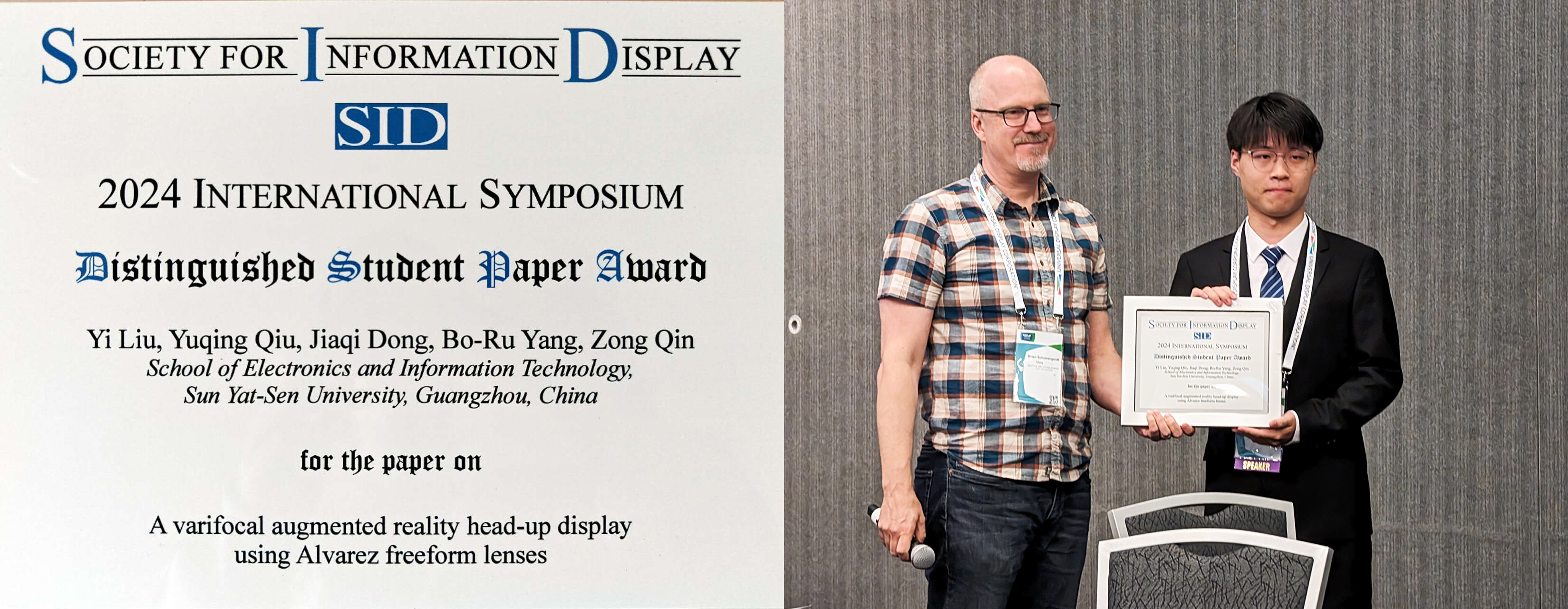 该项目主要参与人员还包括刘一同学(我院2018级光电本科,2022级电子科学与技术硕博连读)和董家麒同学(我院2017级光电本科,2021级集成电路工程硕士)。并且,该项目的研究成果于2024年以论文《Varifocal augmented reality head-up display using Alvarez freeform lenses》在美国圣何塞举办的显示领域顶会SID Display Week获得Distinguished Student Paper Award,刘一同学为第一作者。该奖项获奖率低于5%,获奖人来自斯坦福大学、中佛罗里达大学、Google、Meta、索尼、京东方等一流单位。